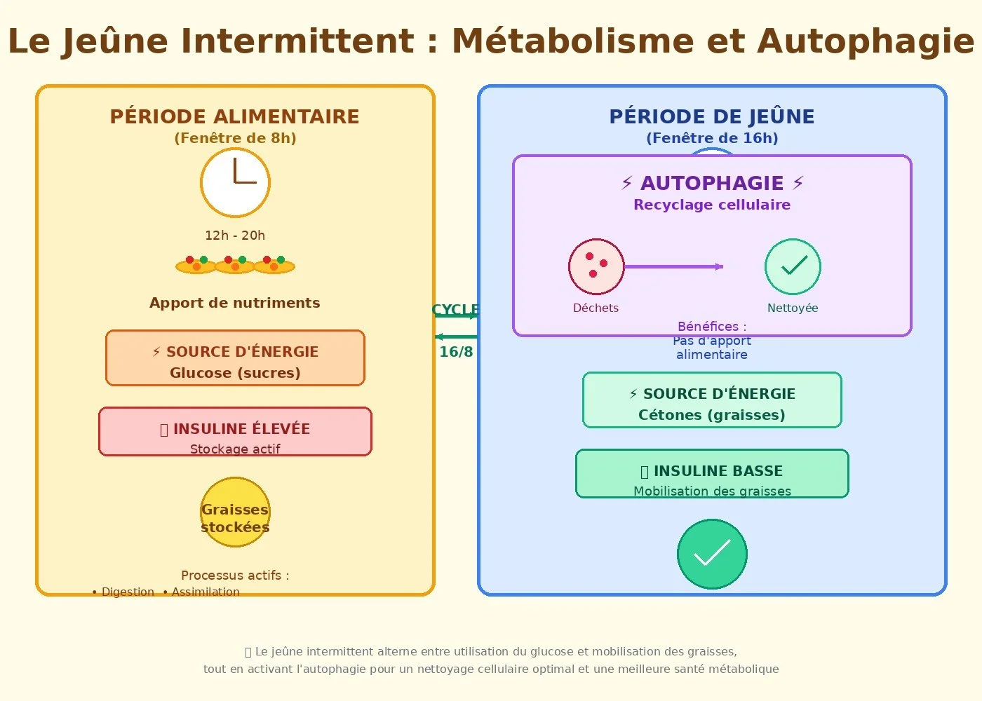 Durant le jeûne, l'organisme active un mécanisme fondamental appelé autophagie, processus au cœur des recherches du Prix Nobel de médecine 2016. Ce système de recyclage cellulaire permet l'élimination des composants endommagés et la régénération des cellules. Les bénéfices incluent une réduction de l'inflammation systémique, un renforcement du système immunitaire et une meilleure protection contre le vieillissement prématuré.