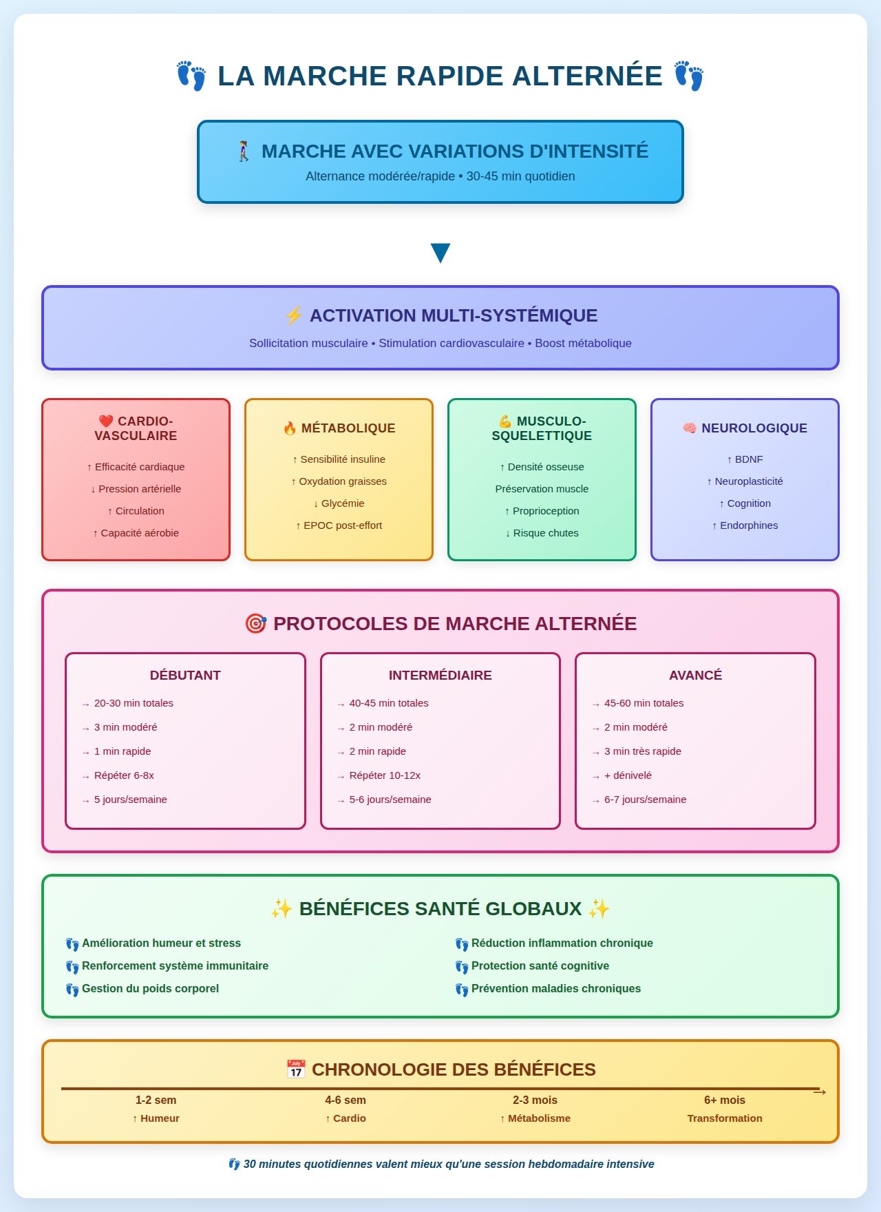 La marche constitue l'activité physique la plus naturelle et accessible à l'être humain. Au-delà de sa simplicité apparente, elle déclenche une cascade de bénéfices physiologiques touchant l'ensemble des systèmes corporels. L'alternance entre marche modérée et phases rapides, inspirée des principes de l'entraînement par intervalles, amplifie ces bénéfices tout en préservant l'accessibilité caractéristique de cette activité. Cette stratégie transforme une simple promenade en véritable outil thérapeutique et préventif.