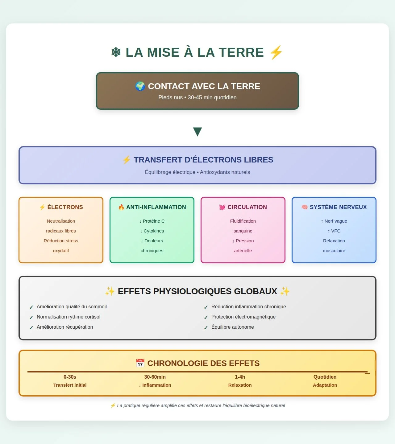 La mise à la terre représente une pratique d'une simplicité désarmante, accessible à tous, sans coût et aux bénéfices potentiellement considérables. Les données scientifiques convergent vers la validation de nombreux effets physiologiques bénéfiques.