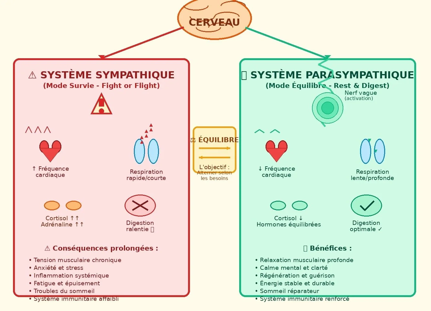 Le système nerveux autonome se divise en deux branches principales : le système sympathique (activation, action) et le système parasympathique (repos, digestion, régénération). Le mode survie correspond à une activation prolongée du système sympathique, état normalement transitoire face à un danger.