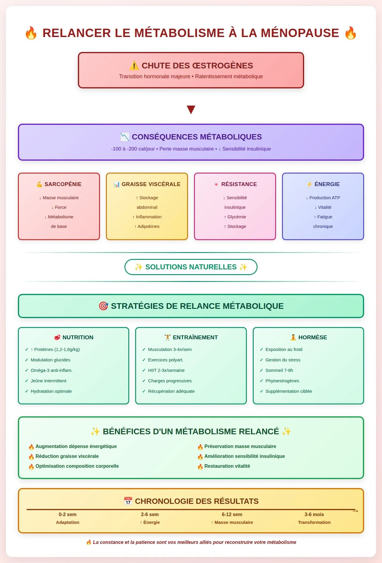 Le ralentissement métabolique de la ménopause n'est pas une fatalité mais un défi physiologique nécessitant une approche stratégique. L'optimisation simultanée de la nutrition, de l'entraînement, de la gestion du stress et du soutien hormonal naturel permet de restaurer une dépense énergétique optimale.
